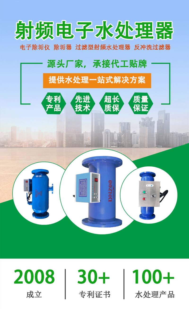 产品别名:射频水处理器、电子水处理器、过滤型射频水处理器、过滤型电子水处理器、电子除垢器、电子除垢仪、电子水处理仪、射频水处理器,空调电子水处理器、循环水电子水处理器、热水系统电子除垢仪、锅炉除垢设备、广谱感应电子水处理器、缠绕式电子水处理器、冷却水电子除垢设备等